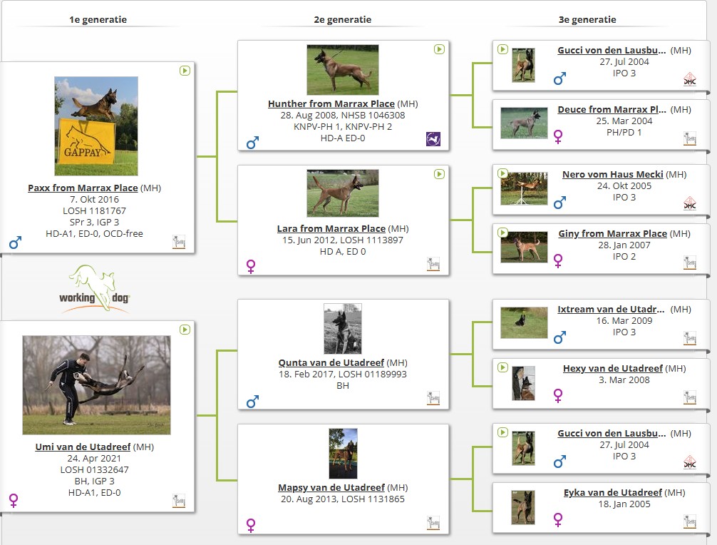 Utamarou des Deux Pottois, born on February 22, 1996, from "Sim des Deux Pottois X Ophelie des Deux Pottois," was a remarkable dog from the "des Deux Pottois" kennel. Utamarou was known for his exceptional physical strength, cheerful demeanor, and sociable nature. He possessed a strong character, intense work drive, and exceptional skills in the 3 competition disciplines: tracking, obedience, and protection work. Utamarou excelled in bite work, obedience, and tracking with a strong, precise bite. He was a dependable and stable dog.